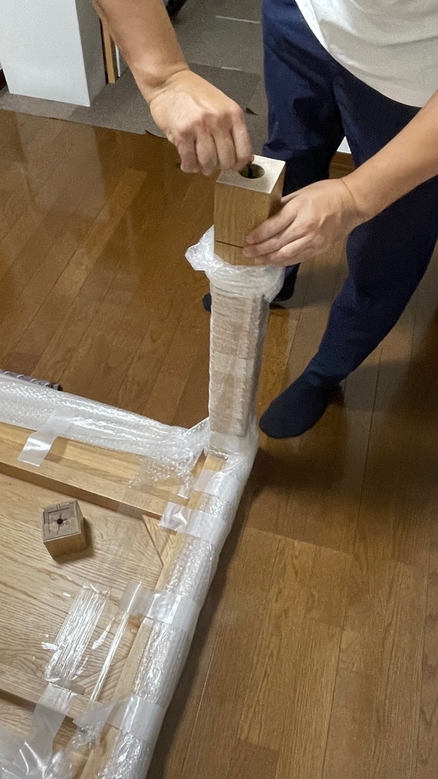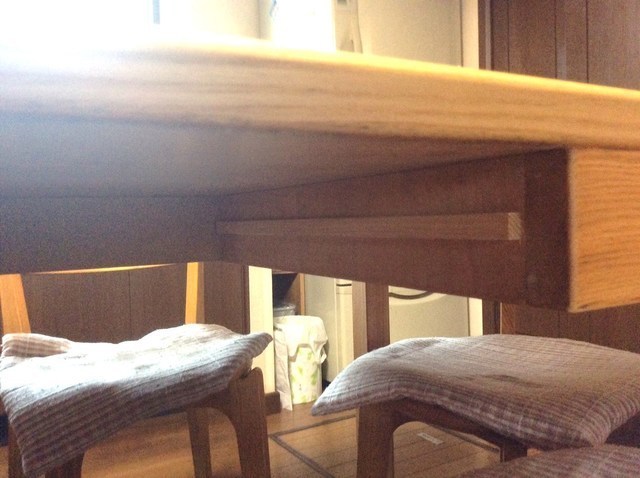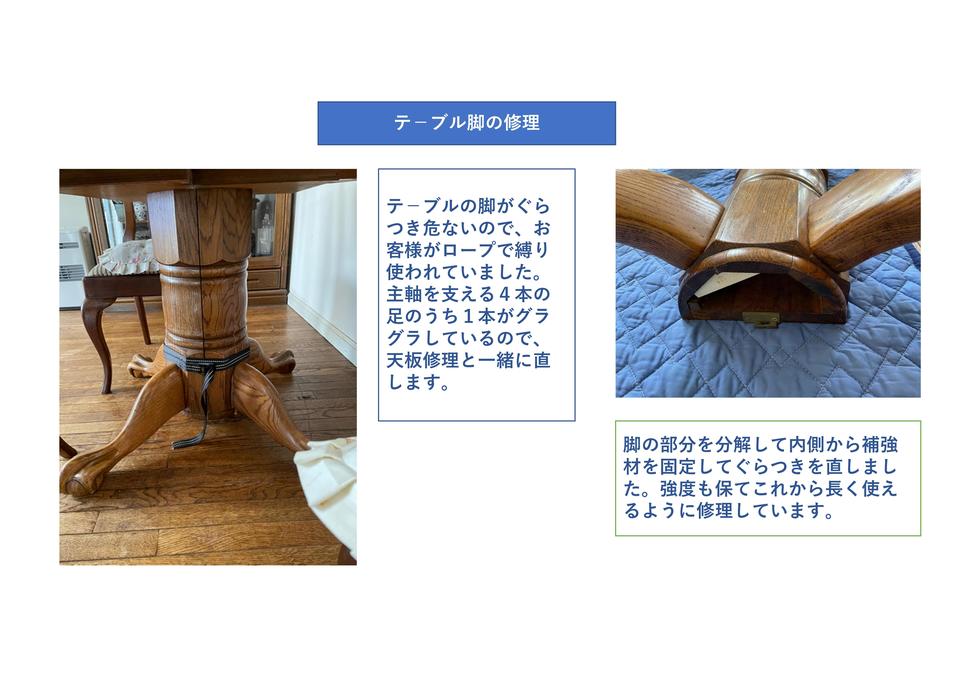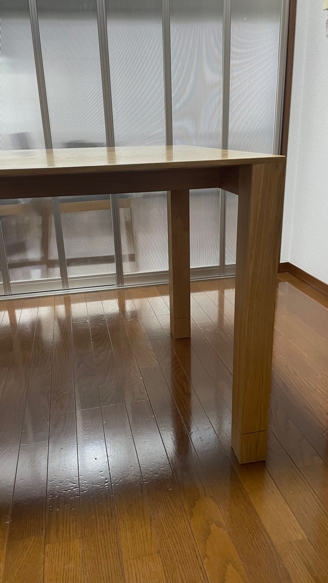 お話を聞くと外国に滞在中に買い求めたダイニングセットで脚が外れなく一体にの為、脚を10cmカットして接続できるようにしました。