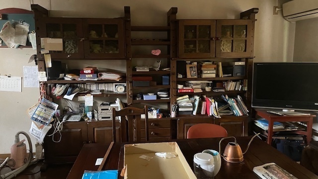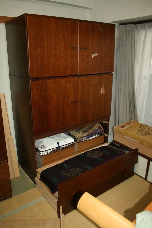 40年以上使われた家具です。扉は枠が壊れ閉まらないのでひもで結び、取っ手はいくつかないところありました。金具は塗装がはがれてよごれがひどい状態です。