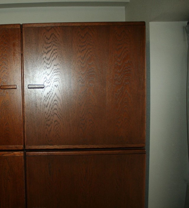 キャビネット扉の修理です。扉の開け閉めがスムーズに動かなくなり現場での修理になりました。かなり大きいキャビネットで移動するだけでも大変なので職人を連れて伺うことになりました。