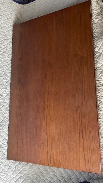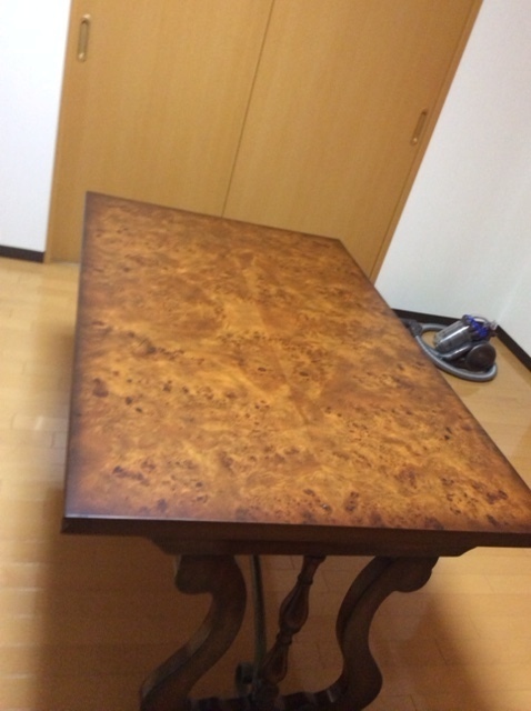 テ-ブルの天板再塗装でしたが、表面のキズが多く仕上がりがきれいにならないので、天板の表面数mm全体に削り元の天板を少し残して、その上から新たに突板(厚み3mm)を貼りました。仕上がりでは数mm高さが高くなります。
