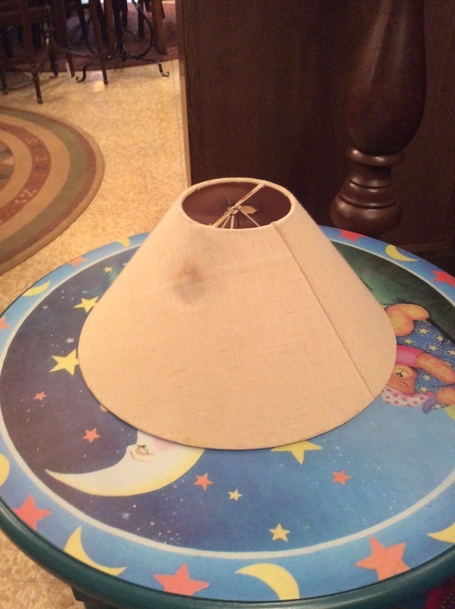 卓上ランプを倒してしまい熱で穴があきシェードを貼り替えました。お客様は、生地はイギリスエジンバラで作られたリネン生地を選ばれています。