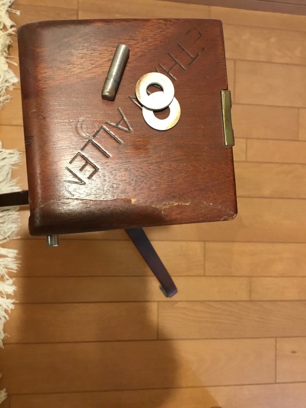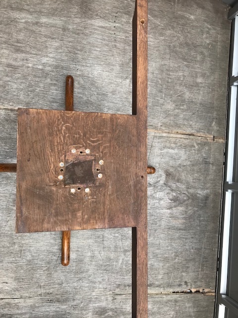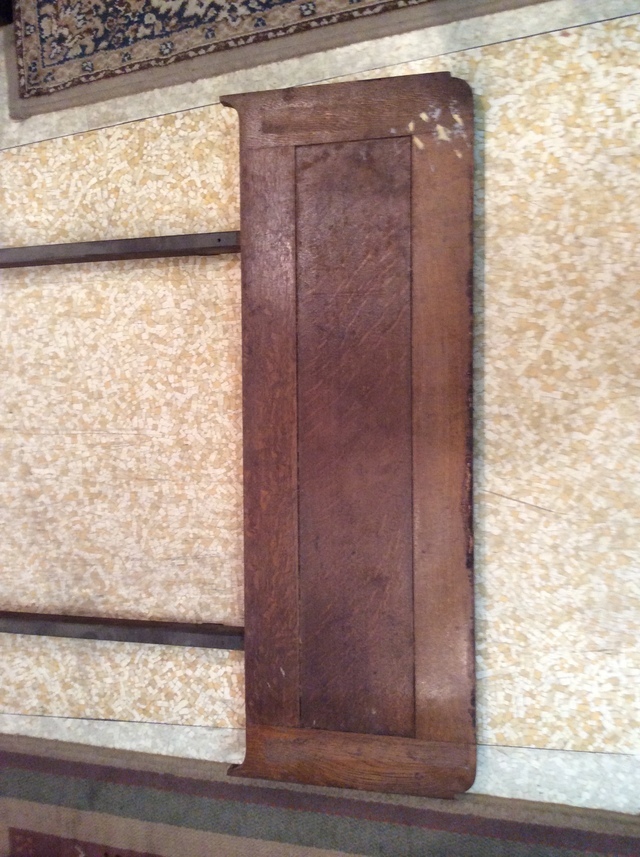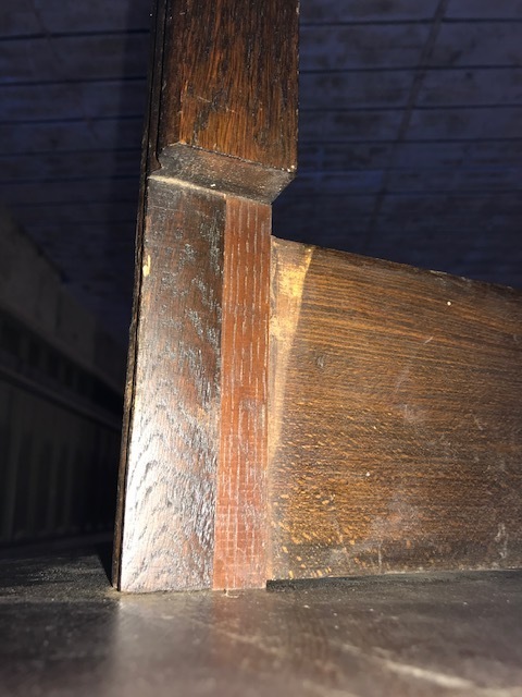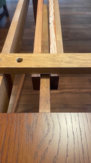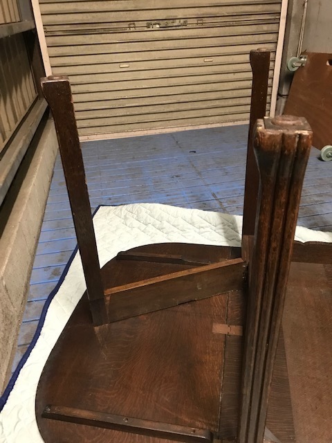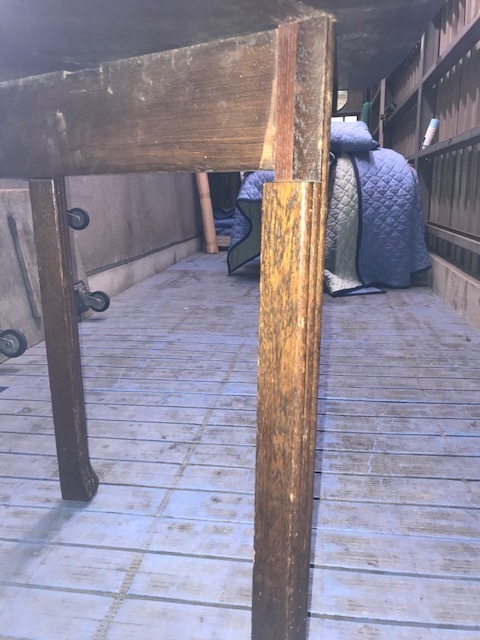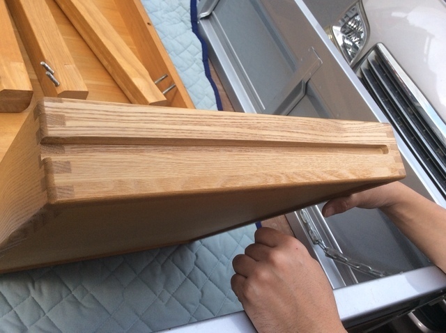 なかなか分解する方法がわからず金具を外しても動かないので、中を開いて固定しているビスが見つかり順番に解体しました。全てがオーク材の厚い無垢材出来ているので慎重に作業をしました。