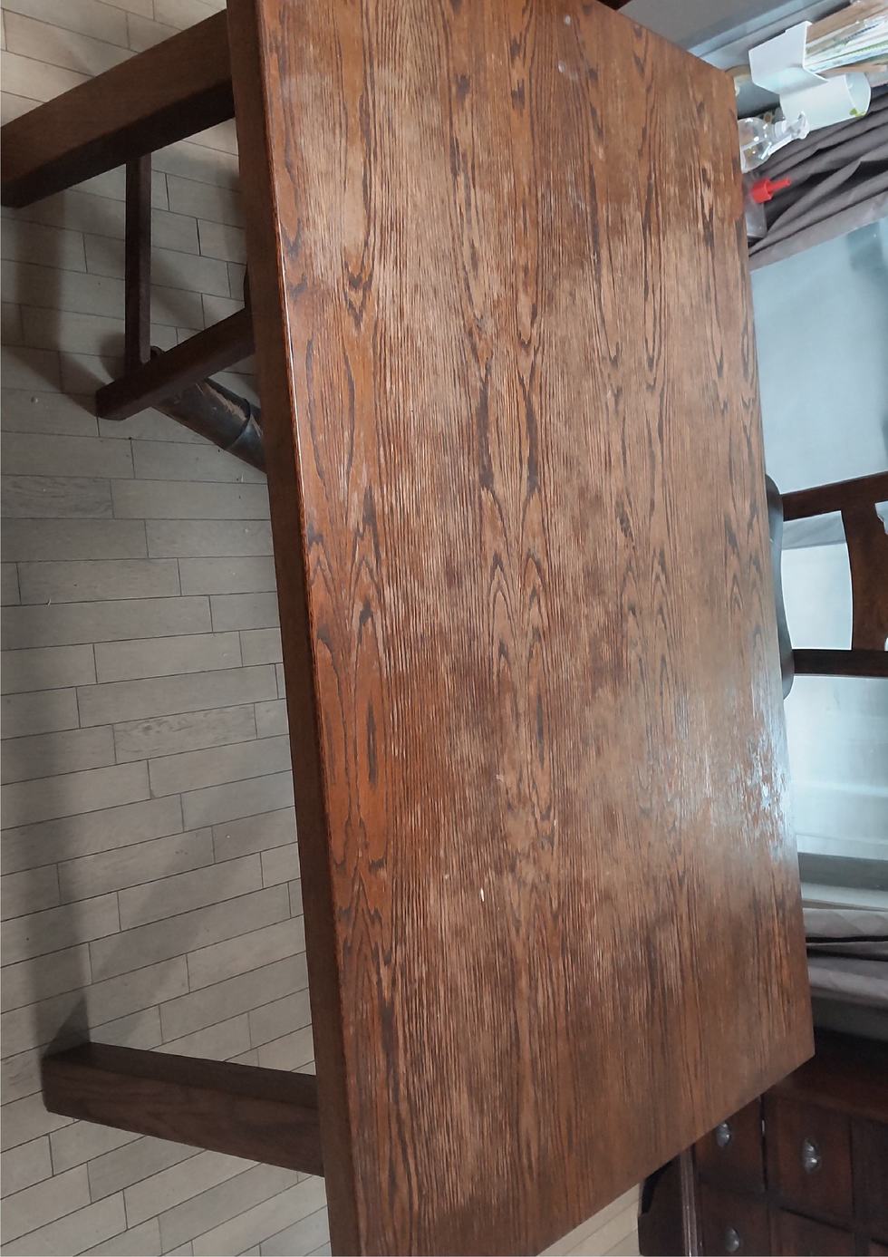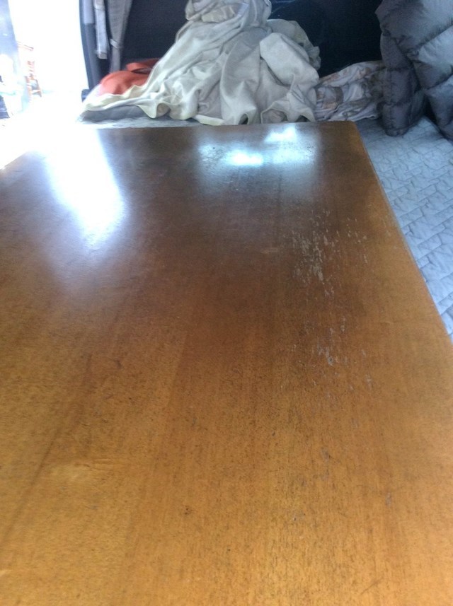水が染み込み木が削れて凸凹が出来るところや熱い飲み物が入ったマグカップなどを直接置いたり、冷たい飲み物が入ったグラスを一晩テーブルに置いておくと水が染み込み白い輪染みが付きます。塗装の劣化もあります。普段のお手入れをしていただくと塗装の持ちが良くなりますのでご紹介します。