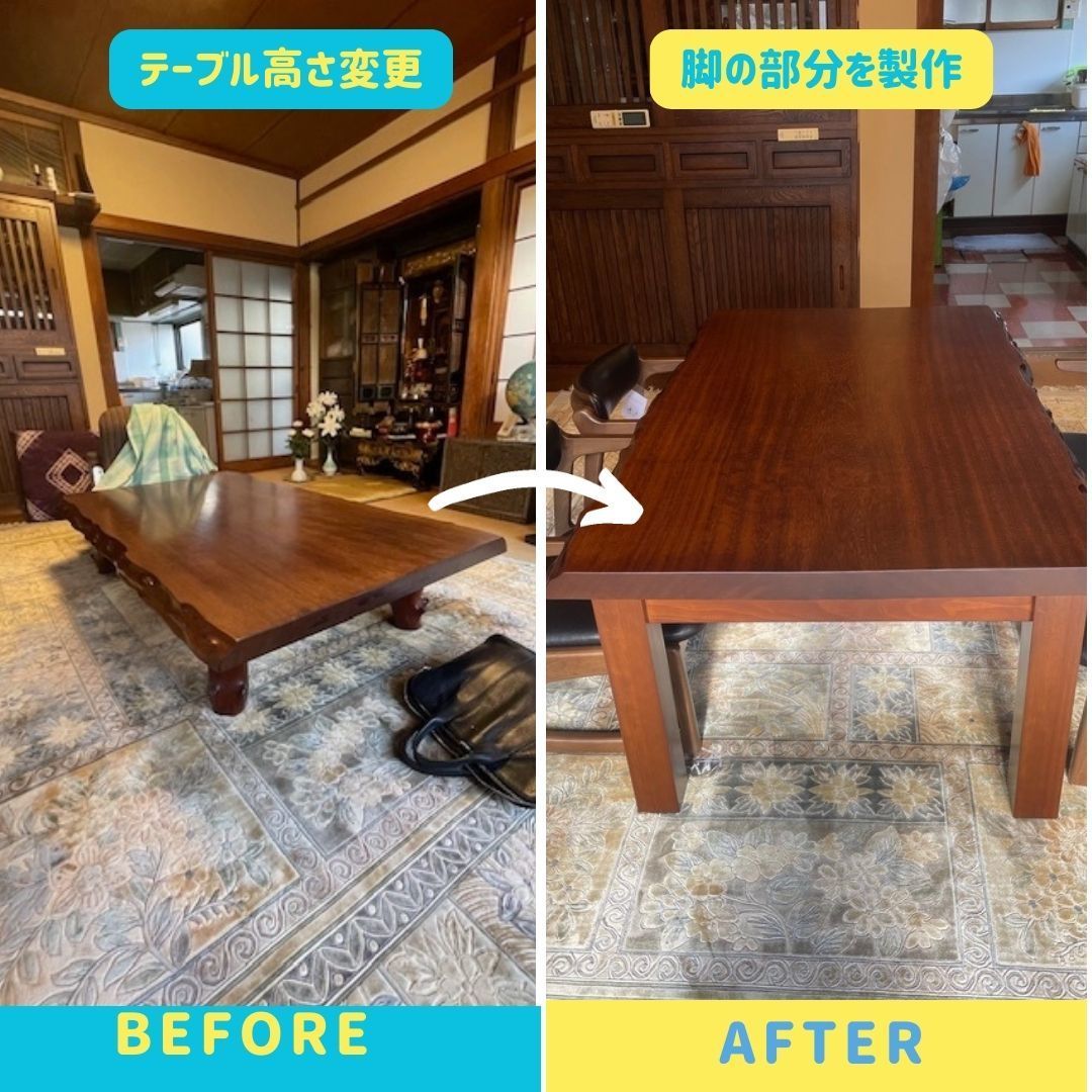 テーブルの高さが75cmあり、引っ越しをした際、玄関から入らなく2階なので窓から入れて費用が高く、近いうちに引越予定があるので、高さを低くする相談がありました。