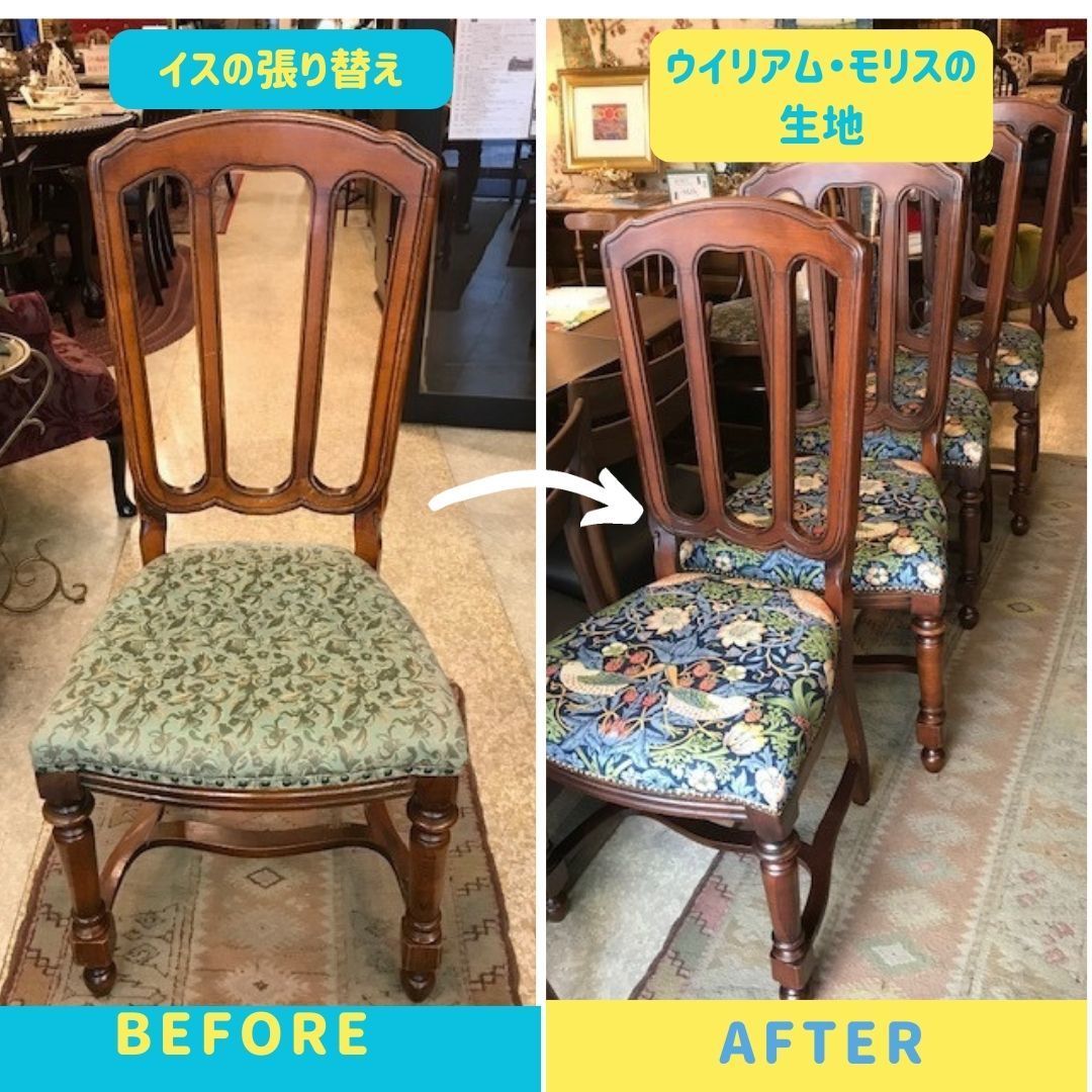 家具の修理・イスやソファの張替えを 、お客様のご要望にお応えしまして送料の半額を当店で負担させていただきます。 ★張替え際は生地や修理方法などご相談ください。 ★例えば、違う雰囲気にしたいときはご希望をお話しいただければお勧めの生地をご紹介致します。イスのぐらつき修理や塗装剝がれの修理など座り心地の問題も大きな悩みです。 よくお聞きするのは、イスの高さを変えることは出来るかですが、大体は出来ますので安心してください。新品同様に仕上げをするように心がけています。 【お支払いのお願い 】 ご依頼の時に半金をお振込みいただき、残金は仕上がりの画像を見ていただきお振込み後に発送させていただきます。