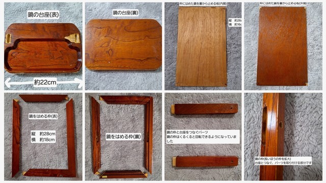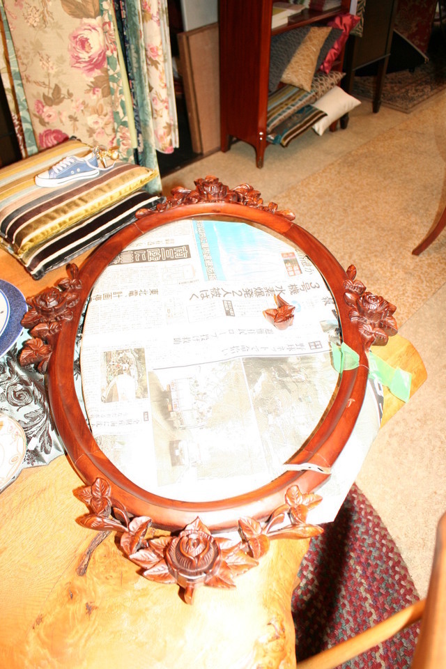 壁掛けのミラーが落ちてかなりひどい状態でこわれてしまいまた。ミラーが割れて木製のフレームは割れて、バラの飾りが欠けたりしていました。お気に入りで長くお使いもミラーでしたので補強をしてしっかり直したと言われましたのでこれからも長く使えるようにします。