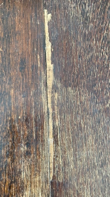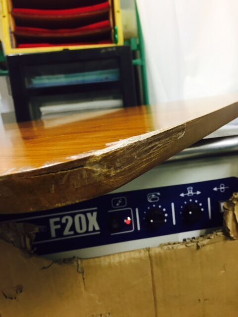 テ-ブルは天板表面の傷みがあるので、切れ目の部分が動かないように表・裏に補強材で固定してから天板表面材を数mm削り、突板を貼り仕上げています。