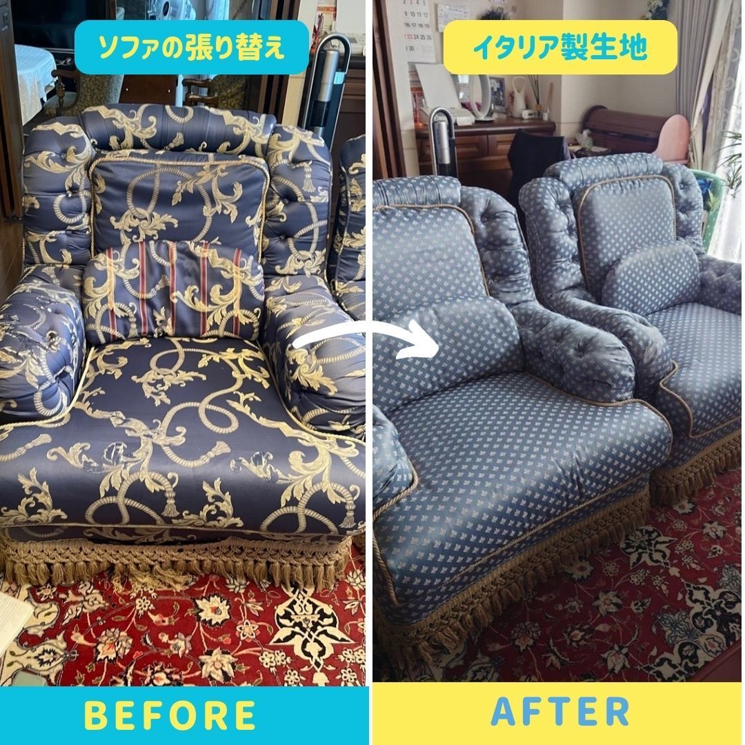 | ダイニングイスの張り替え ソファの張り替え(3人掛け) | ¥18,000(平均1脚生地代込み) ¥200,000~ |