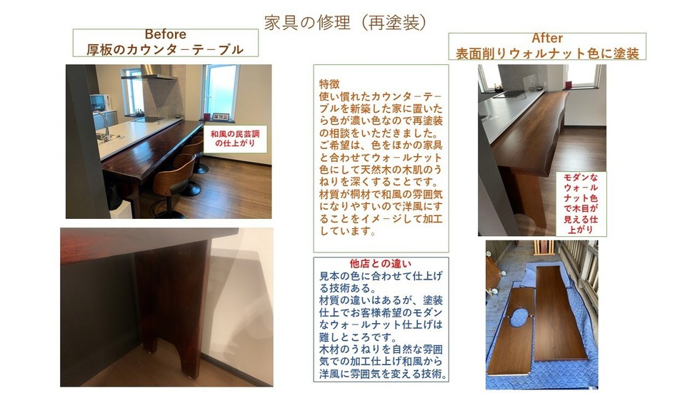 1,古い家具をリメイクするアイディアがお客様のご要望で、毎日新しく家具を新しく生まれ変わり喜んで頂いています。テーブルのサイズを小さくする・部分使用して別の用途の家具にする・タンスを分割して使えるようにするなど様々です。 2,塗装仕上げ色や仕上げを変える、ハンドルや取っ手の交換。 3,修理と補強が必要で家具に傷や欠陥があるので、家具の構造的なことを変えたい。 4,イス・ソファは状態により構造を変えることやデザインを考え高さを調整・壊れた飾りは再生・好きな色で仕上げる。板張りの椅子で長い時間座ると腰が痛くなる場合はクッションを乗せて張りぐるみ仕上げで高さ調整。 当店では様々な家具のリメイクや修理・修復の実例がありますので、お問い合わせフォームから相談ください。