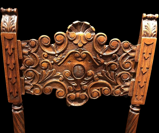 家具の特徴は、立体的なハイブリット(高浮き彫り)な彫刻が多くなり堅いオーク(ナラ)材では難しくウォールナット(くるみ)材に代わっていきました。デザインは、豪華な彫刻が前面・側面の3面の細部まで平らの部分がないくらい人物や果物やアカンサスの葉などの彫刻が施されている工芸品です。